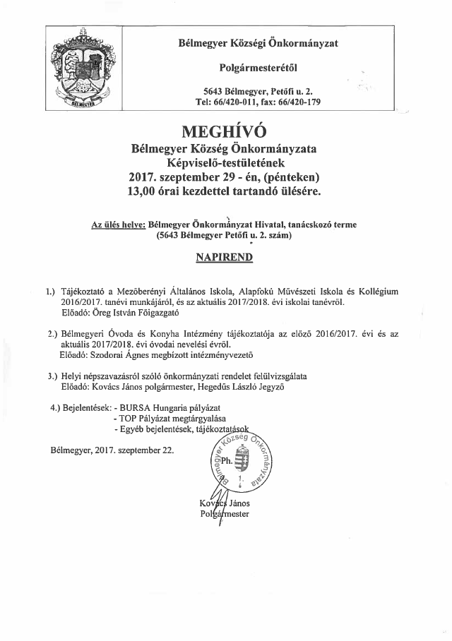 Bélmegyer Község Önkormányzata Képviselő-testületének 2017. szeptember 29-én (pénteken), 13:00 órai kezdettel tartandó ülésére tisztelettel meghívjuk a kedves lakosokat.